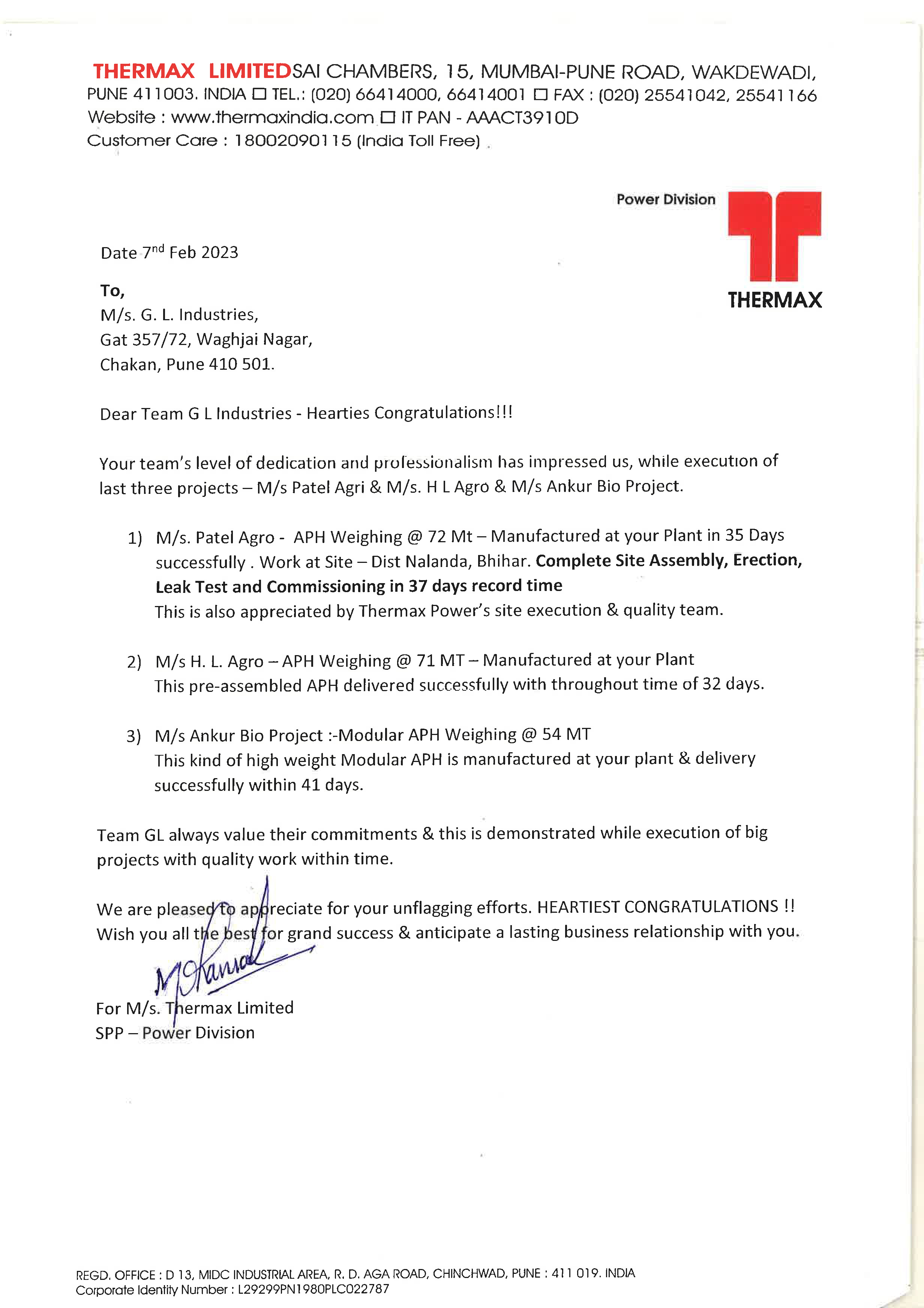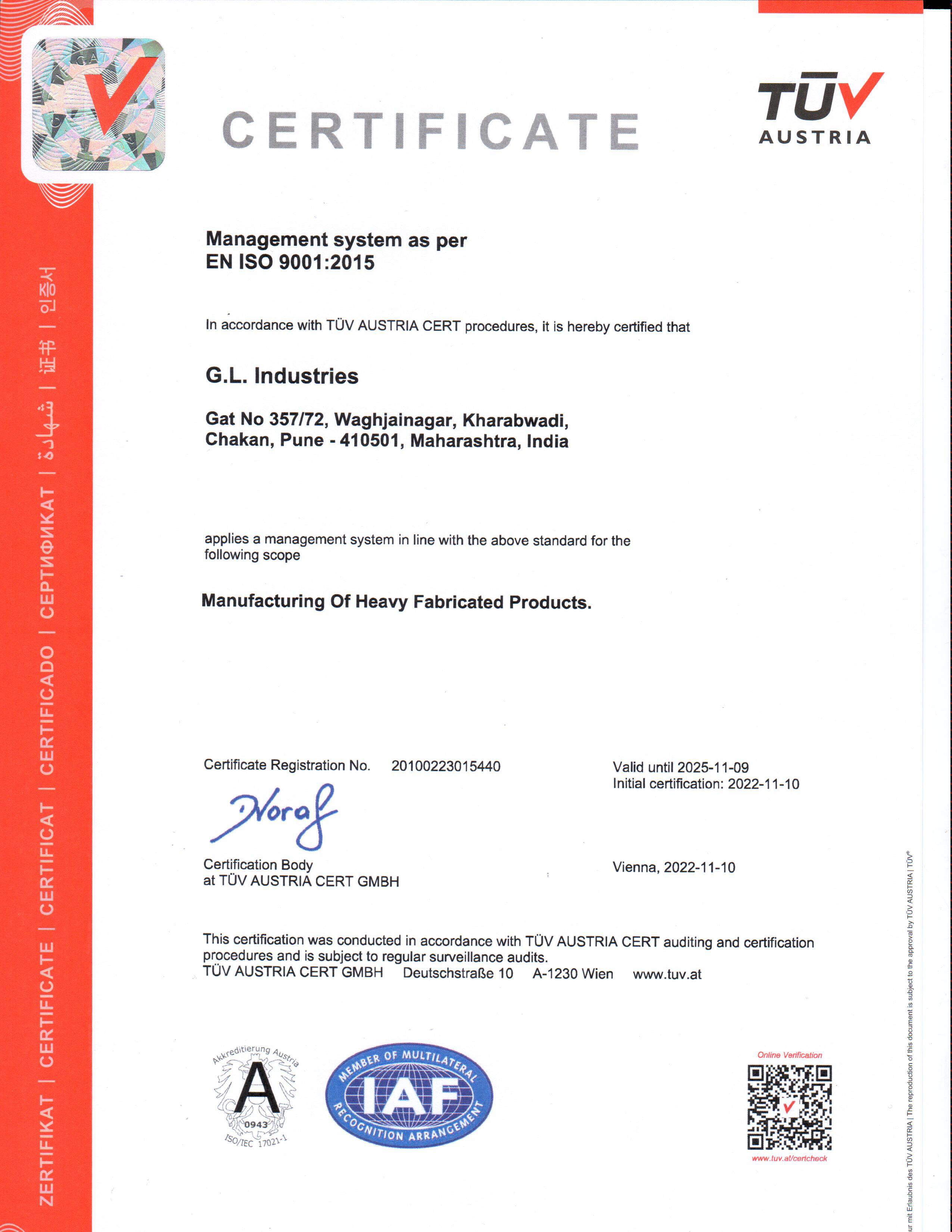 We hereby derive great pleasure to introduce M/s. G. L. Industries - as an ISO 9001:2015 certified company. M/s. G. L. Industries is a partnership firm engaged in the manufacturing of heavy industrial products ; established by team of professionals.